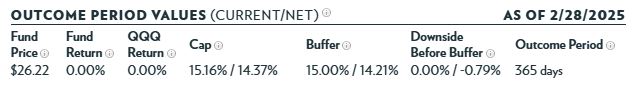 출시일은 2025년 2월 28일이며, 출시일 가격은 $26.22입니다. Fund Return은 아직 운용전 시점이므로 0%입니다. 추종하는 지수인 QQQ의 Return도 시작일 기준이기 때문에 0%입니다. 초기 Cap(상한선)은 15.16%입니다. 운용비용을 제외하면 약 14.37%가 됩니다. 즉, 만기까지 최대 14.37%~15.16% 수익 제한이 있습니다. 초기 Buffer(버퍼)는 15%입니다. 이 역시 운용비용을 제외하면 약 14.21%가 됩니다. 즉, 만기일까지 최대 14.21%~15%의 손실을 방어한다는 것입니다.