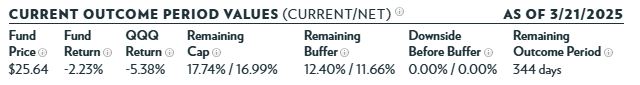 출시일은 2025년 2월 28일이며, 출시일 가격은 $26.22입니다. Fund Return은 아직 운용전 시점이므로 0%입니다. 추종하는 지수인 QQQ의 Return도 시작일 기준이기 때문에 0%입니다. 초기 Cap(상한선)은 15.16%입니다. 운용비용을 제외하면 약 14.37%가 됩니다. 즉, 만기까지 최대 14.37%~15.16% 수익 제한이 있습니다. 초기 Buffer(버퍼)는 15%입니다. 이 역시 운용비용을 제외하면 약 14.21%가 됩니다. 즉, 만기일까지 최대 14.21%~15%의 손실을 방어한다는 것입니다.