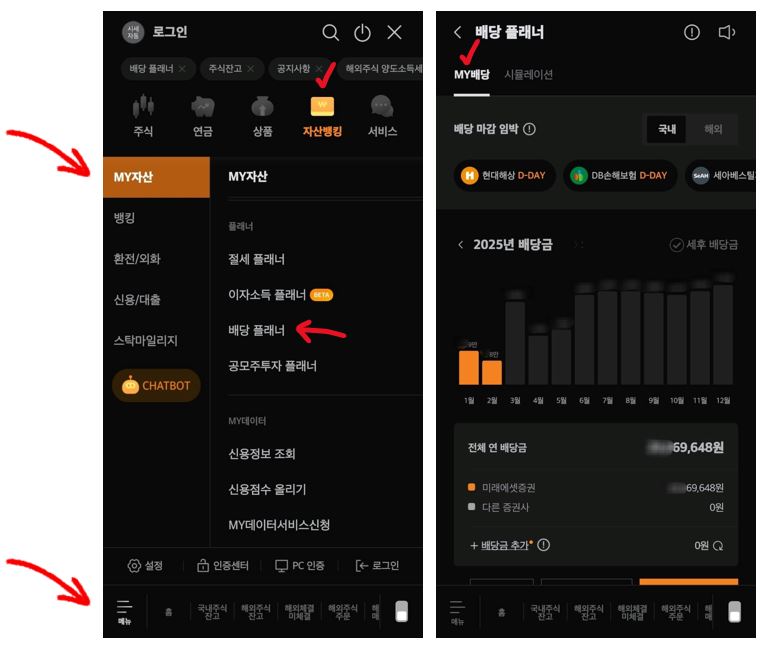 먼저 왼쪽 이미지처럼 '메뉴'를 누르시면 상단에 '자산뱅킹'을 선택합니다. 그러면 'MY자산'이라는 탭에서 중간에 '배당 플래너'라는 것을 선택해 줍니다.
