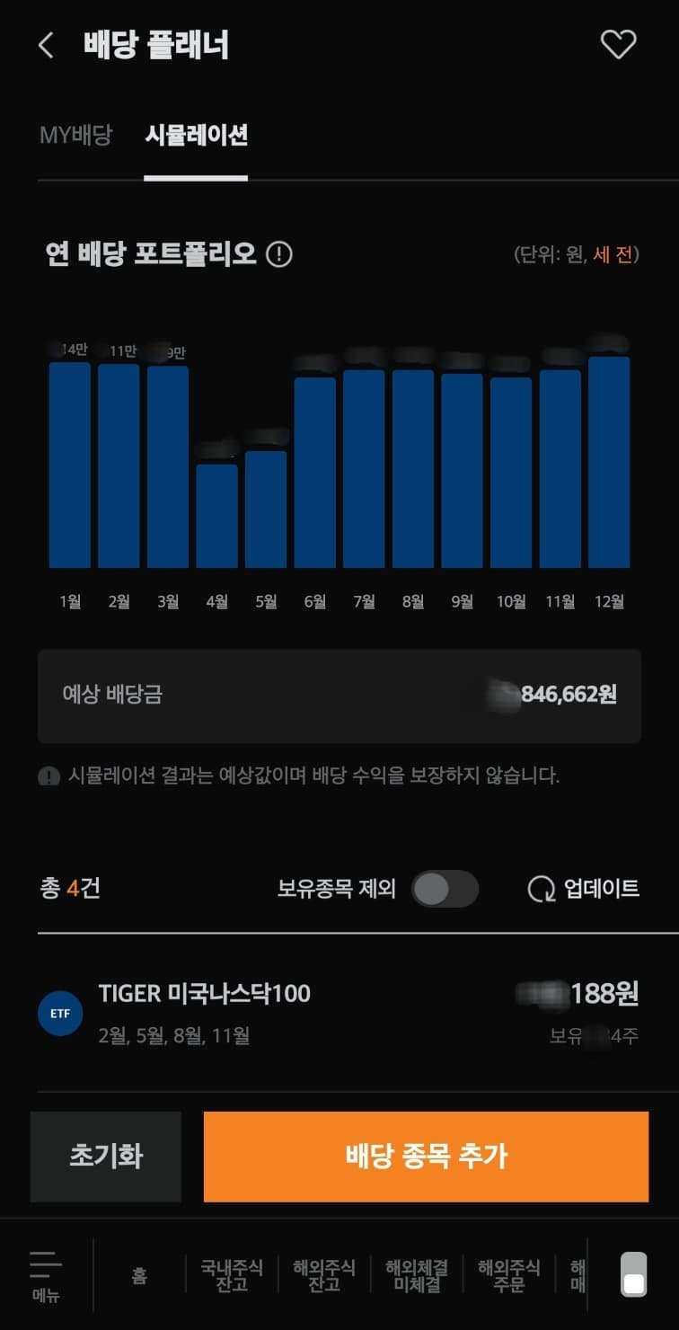 그리고 아래 이미지를 보시면 '시뮬레이션' 탭에서 포트폴리오에 따라 어떻게 배당금이 달라지는지 시뮬레이션도 확인이 가능합니다. 즉, 새로운 배당 종목을 추가하거나 이미 보유하고 있는 종목을 삭제해봄으로써 앞으로의 배당금이 올라가는지 내려가는지 쉽게 확인이 가능합니다.