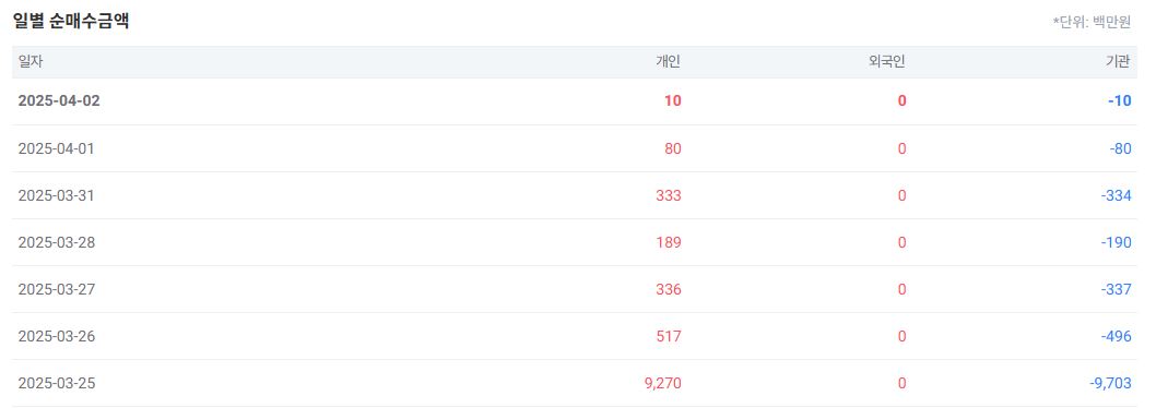 3월 25일 출시일의 경우 개인의 매수금액이 약 92억 7천만원으로 가장 많습니다. 참고로 현재 순자산 총액은 약 900억원정도이며, 총 보수는 0.39%입니다. 수익으로 인한 세금은 배당소득세 15.4%가 적용됩니다. 오늘 기준 거래량은 약 3만주 정도 입니다.