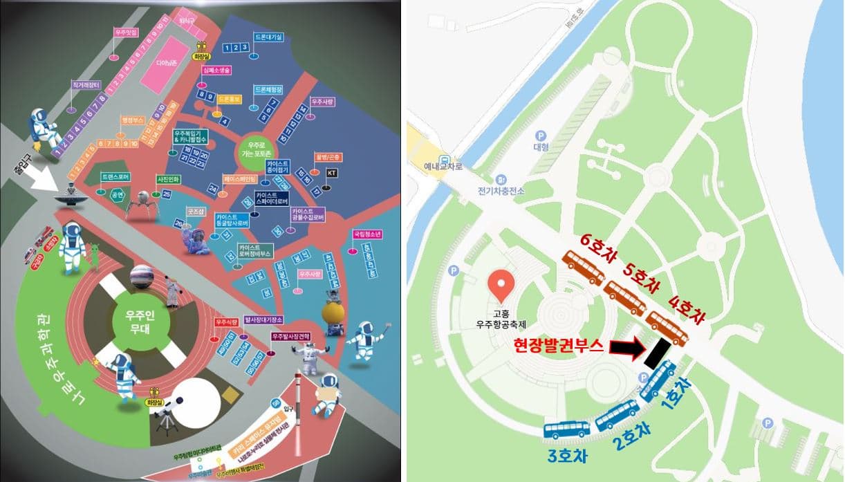 위에 사진에서 왼쪽 그림은 고흥 우주항공축제 공식 홈페이지에 나와있는 리플릿인데 처음 방문하시는 분들은 리플릿을 통해서 보기에는 헷갈릴 수 있어서 오른쪽 그림과 같이 네이버 지도에 표시를 해보았습니다.